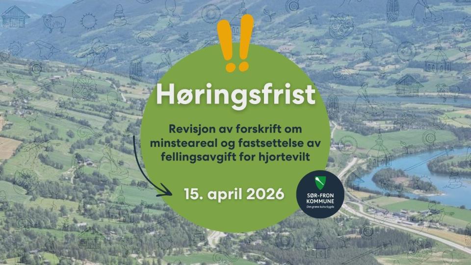 Høring - revisjon av forskrift om minsteareal og fastsettelse av fellingsavgift for hjortevilt Utvalg for miljø, areal og landbruk har i møte 09.03.2026, sak 023/26, vedtatt å legge ut forslag om forskrift om åpning av jakt og fastsetting av min... Publisert 23.03.2026 kl. 15.09