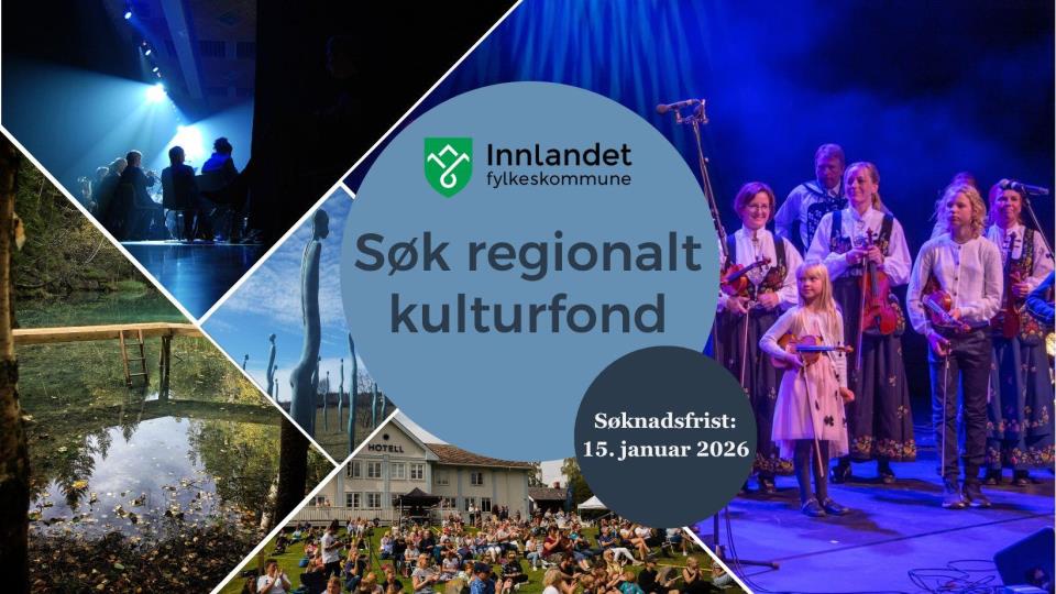 Søk regionalt kulturfond Regionalt kulturfond Innlandet lyses ut for andre gang, nå til aktivitet i 2026. De to tilskuddsordningene Utviklingsprosjekt kunst og kultur og Tilsk... Publisert 12.12.2025 kl. 14.58