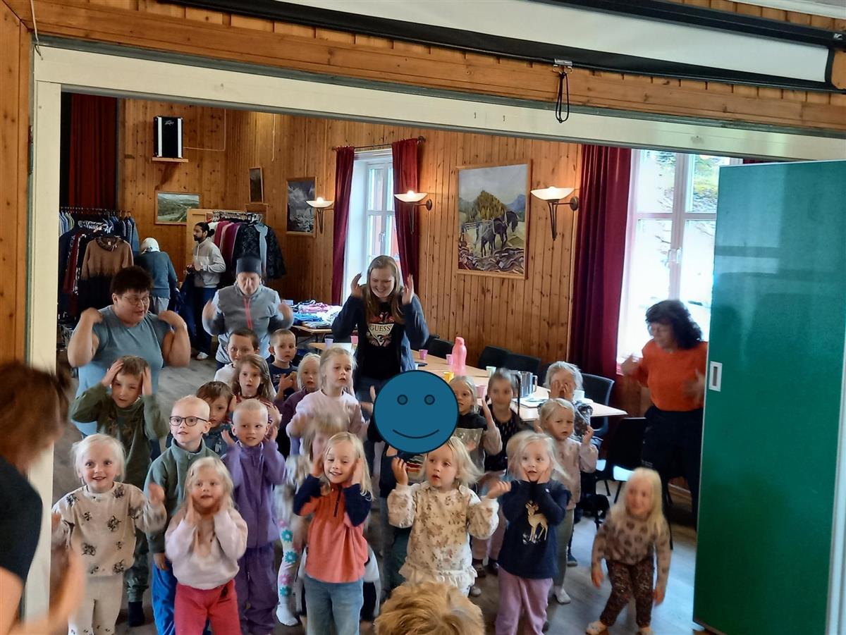 Barnehagen ble med på balansetrim og det ble en stor sirkel i salen denne dagen.