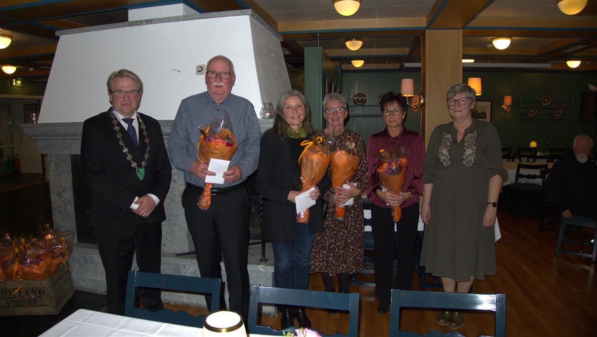 Pensjonistene Stein Inge Plassen, Wenche Haug, Rita Maurstad og Solveig Møllerplass Huse sammen med ordfører Ole Tvete Muriteigen og kommunedirektør Anne Holsbrekken.