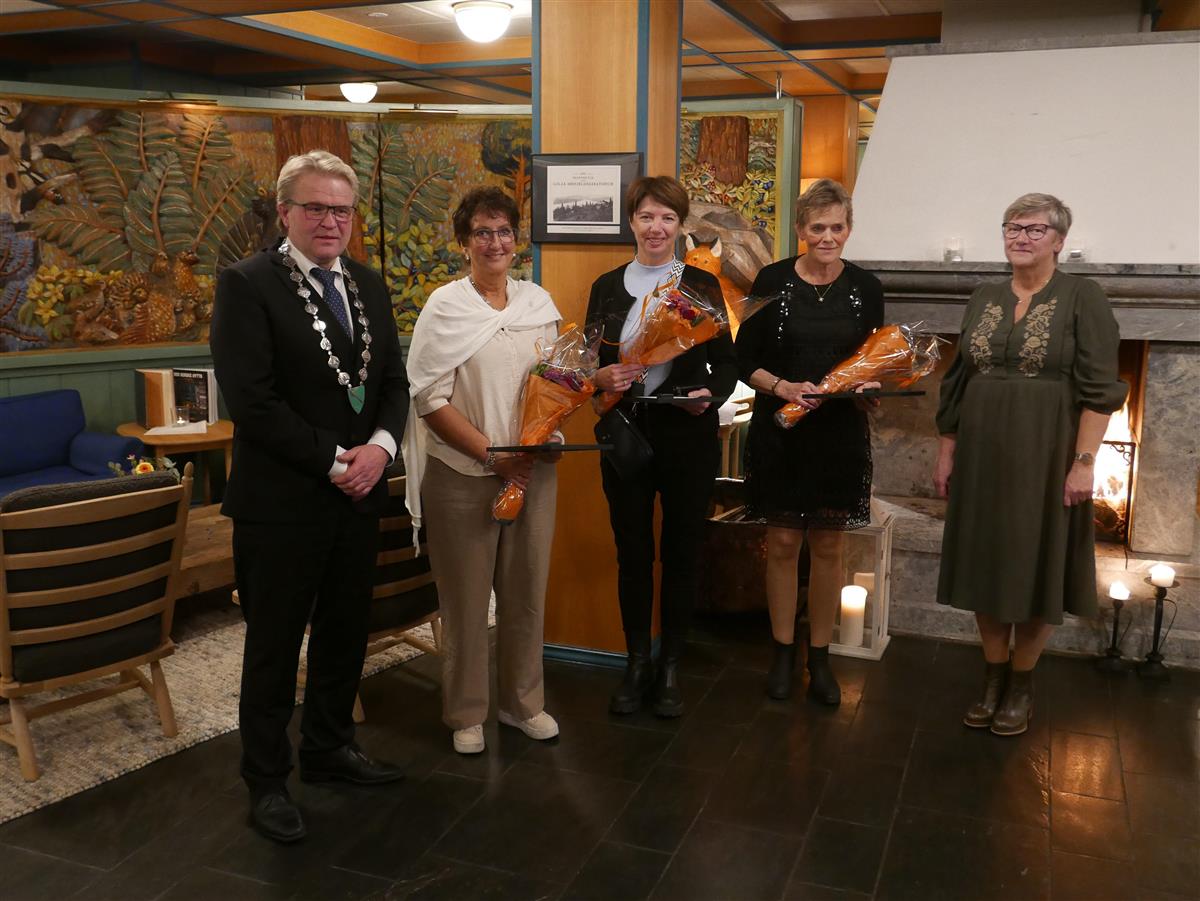 35 år: Anne-Grethe Olstad, Kirsten Lostad, Kristine Brenden Kolås sammen med ordfører Ole Tvete Muriteigen og kommunedirektør Anne Holsbrekken