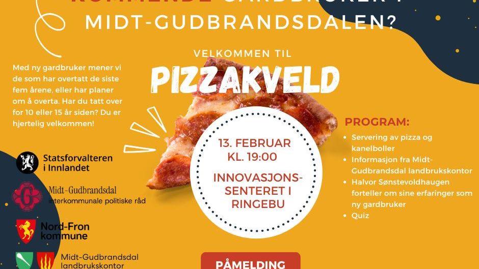 Pizzakveld for nye gardbrukere i Midt-Gudbrandsdalen Er du ny gardbruker i Midt-Gudbrandsdalen og vil treffe likesinnede, spise pizza og få litt info som kan være relevant for deg? Bli med på pizzakveld ... Publisert 10.02.2026 kl. 08.21